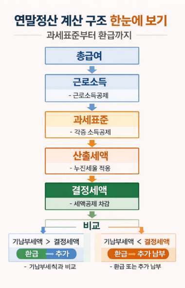 연말정산은 총급여에서 시작해 과세표준, 산출세액, 결정세액을 거쳐 환급 또는 추가 납부로 마무리된다. 이 흐름을 이해하면 연말정산은 더 이상 복잡하지 않다. 계산 구조를 아는 것이 가장 확실한 절세의 시작이다.